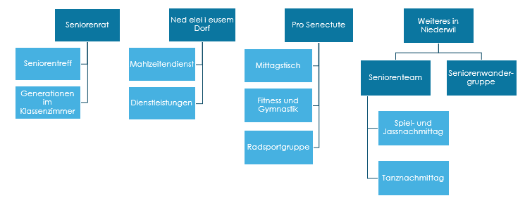 Wenn Sie zu einem Thema mehr erfahren möchten, wählen Sie links im Bereich Senioren die entsprechende Organisation (im obigen Überblick in Dunkelblau) an. Viel Spass beim Durchstöbern.